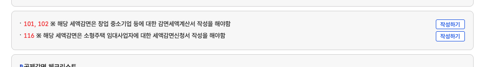 저도 해당 내용을 알고 이번 종소세 신고 때 하려고 했는데 원클릭 신고서비스에서는 자동으로 해당 조건으로 신고가 되지 않습니다..!(중요) 모두채움으로 수동으로 신고해야 적용이 가능한데요. 어떻게 신고하는지 한참 과거 블로그 자료들을 찾아서 저도 신고할 수 있었습니다. 수동신고를 하면서 아주 작게 아래와 같은 문구를 보실 수 있는데요. 이게 저희가 해당하는 항목이더라구요.(101번)